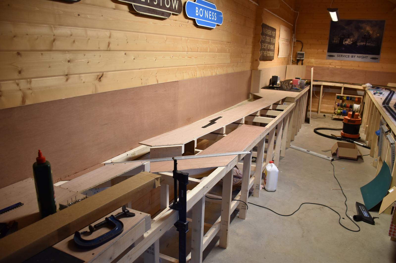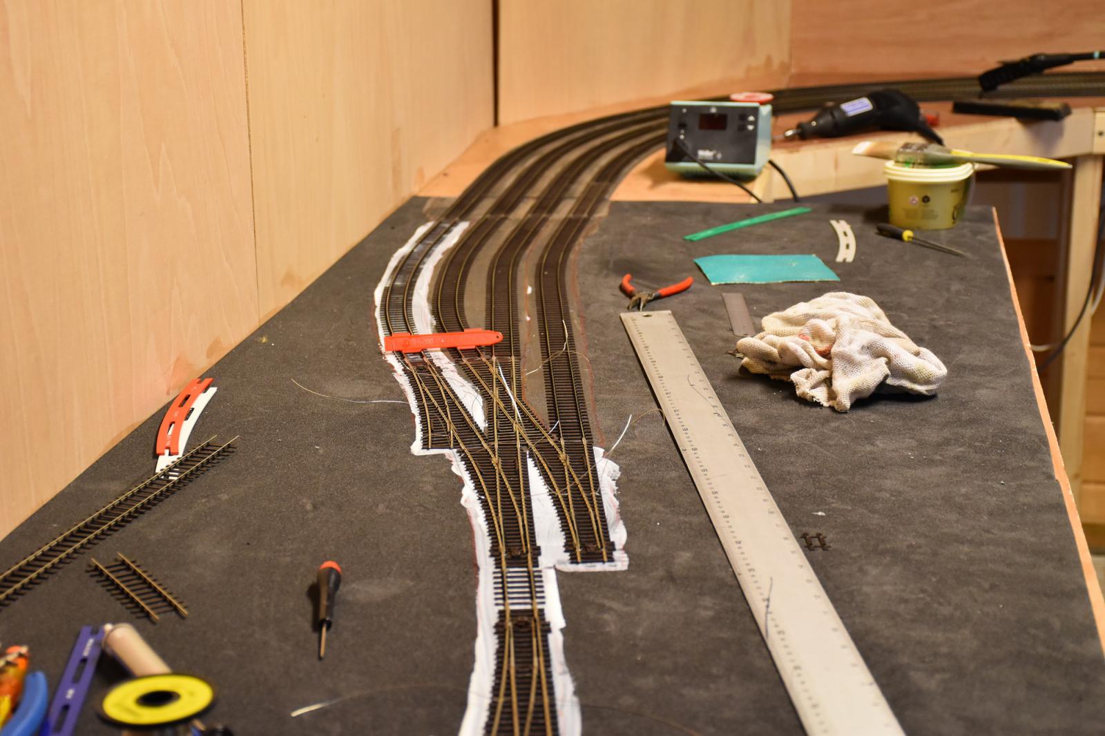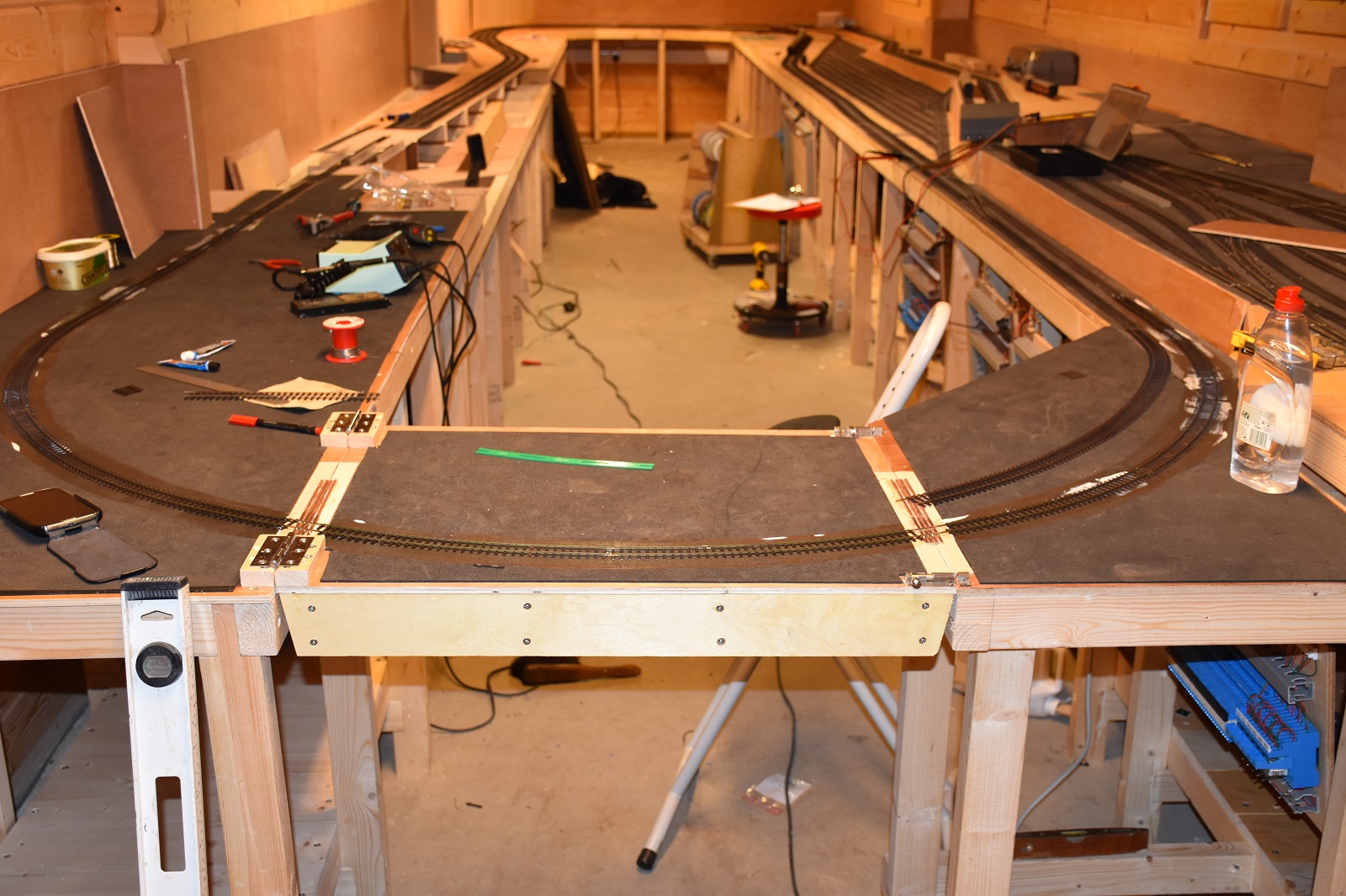 October 2015 Going round the bend on the branch, there is the east end of the carriage sidings and the branch climbing upwards. On my last layout, I used in in 50 which was a bit to steep so this is 1 in 100. |
