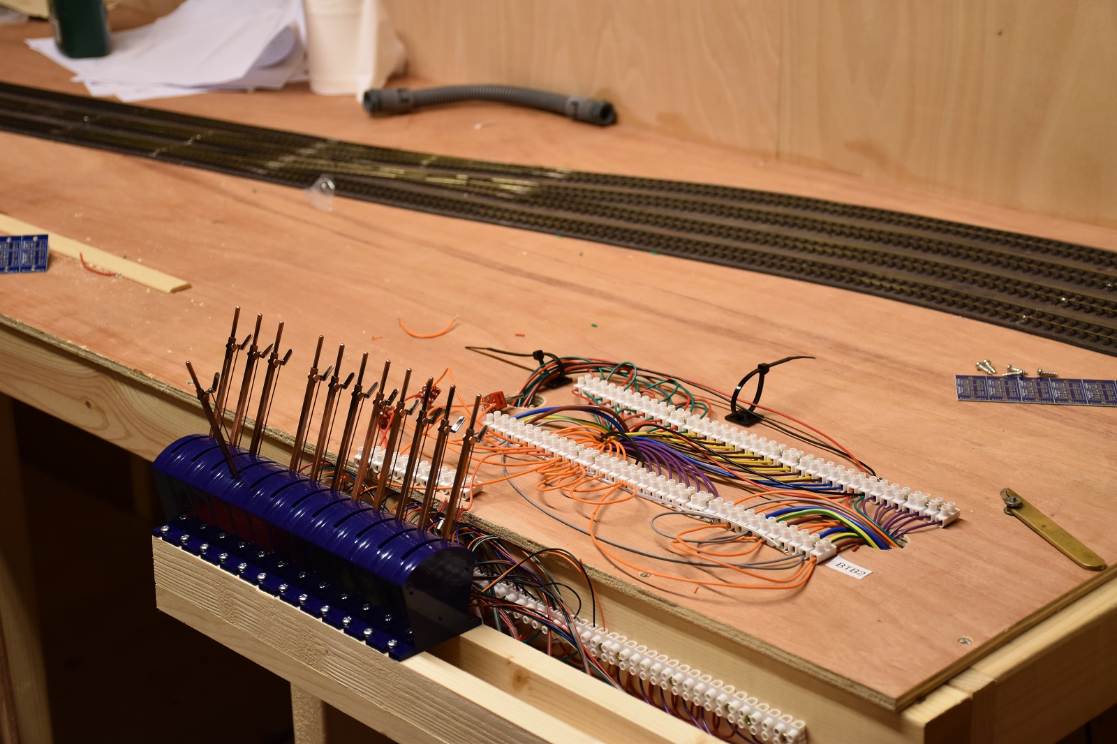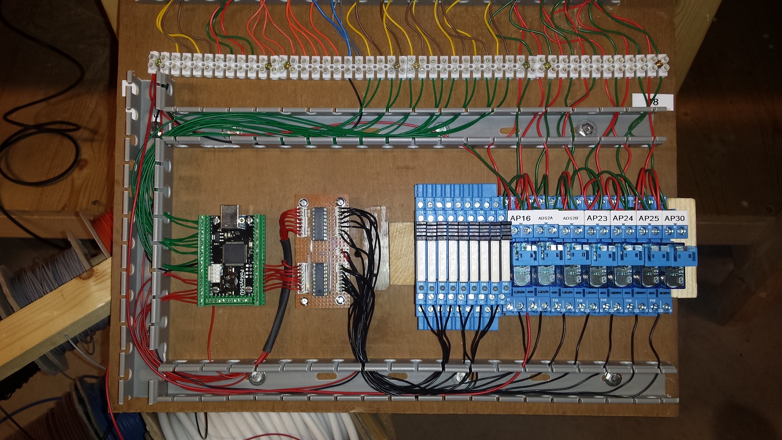 April 2016 I've been plodding on for a while now and it's difficult to see progress. Here's one of the wiring boards nearing completion. On the left with the green connectors is a Pokeys device. This is a neat I/O device that provides over 50 ports which can be programmed as inputs or outputs (and other things besides). It connects to the controlling PC via USB. The green wires are the inputs from the point motors (to detect if normal or reversed). The red wires go to drive relays. To the right of the Pokeys device are 2 ULN2803 Darlington Transistor Array packages. These amplify the outputs so that relays can be driven. The narrow blue packages are single pole relays that I use to switch isolation sections and power sections. The other blue packages are double pole relays used to reverse the voltage to point motors. There's 5 of these boards and I'll need another one yet to drive the signals. |