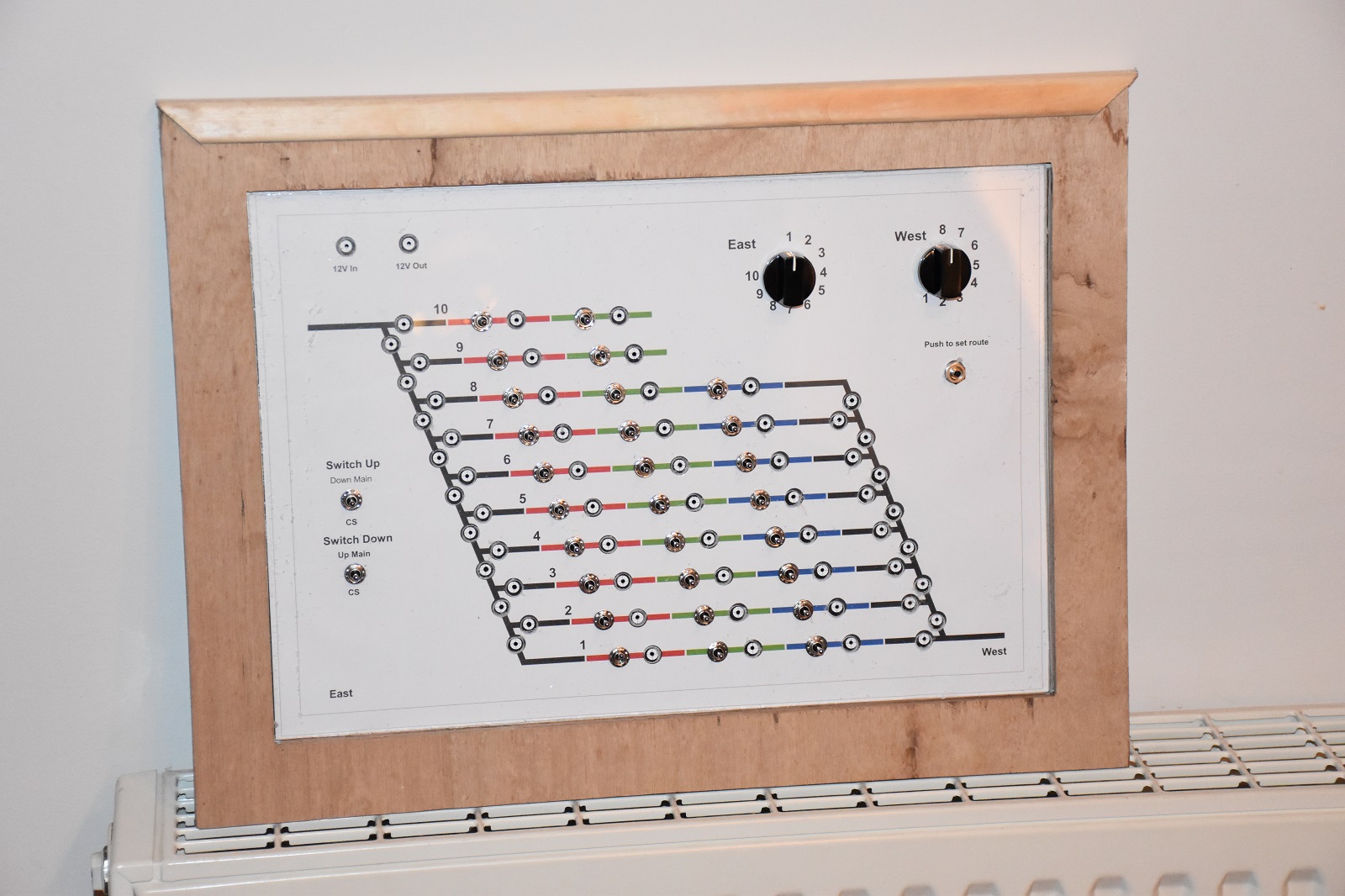 January 2016 Wiring seems to go on for ever with not much sign of progress. This panel is for the fiddle yard or carriage sidings. I use an old version of Design CAD Express to draw the control diagram. This one is printed on A3 paper. It sits on top of a sheet of 1mm thick aluminium with a sheet of 1mm thick clear acrylic sheet on top of that. Once everything is clamped up, I start drilling holes. It's very tedious as I need to start of with a small drill bit and work up gradually. If you try to go in with the right size drill bit to start, it just grabs the acrylic and makes a mess. Either you end up with a not very round hole or the acrylic cracks. As the drill bits get bigger you need to start off with a very slow speed - again otherwise the drill bit just grabs. Later on I discovered a much better way to do it. The idea is to set the route with the rotary switch and press the switch to then operate the motors that need to move. Otherwise a motor would operate at each switch position. In the centre, switches operate the isolating sections and LEDs (not yet fitted will indicate which controller is in control. |