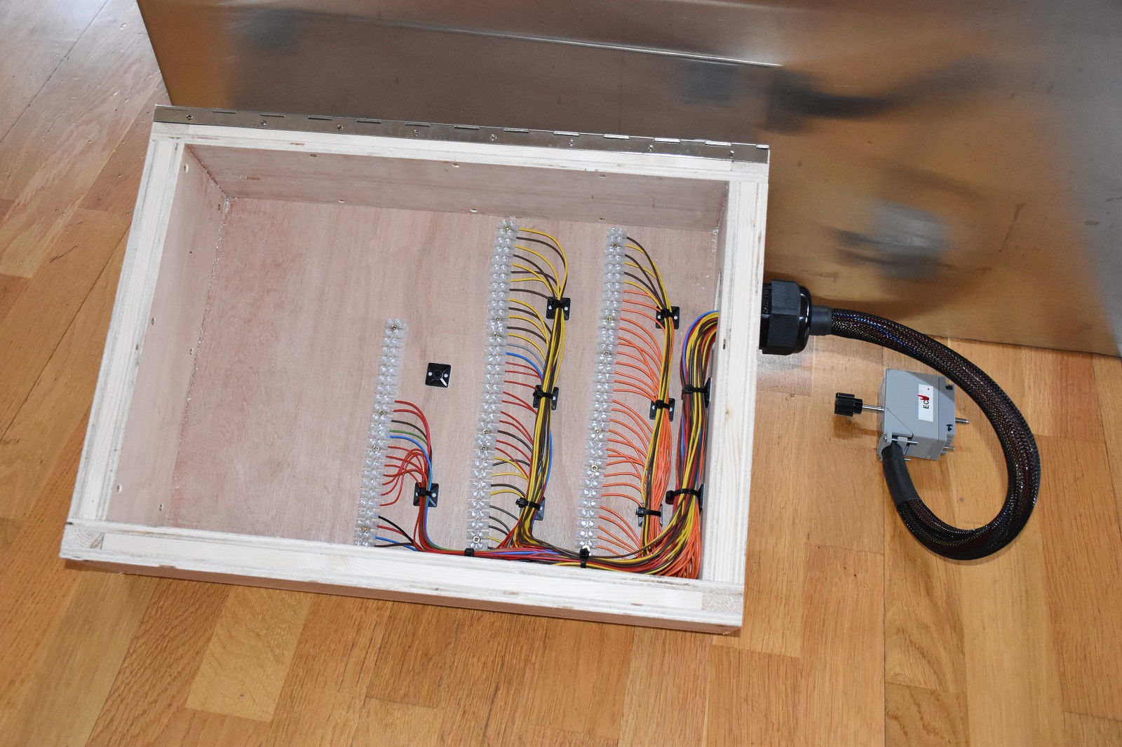 January 2016 Here's the box it sits on. A bit over the top I know but I don't want it to distort. A flying lead with a 90 way plug connects this to one of the swing boards underneath the baseboard. It took all Sunday morning to get to this stage and that was with the plug wired up. |
