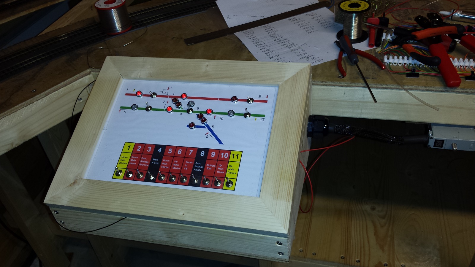 February 2016 This box is for the signal box controlling the east exit from the carriage sidings. As you can see I've finally managed to get some indicator lights on. It's slow work. |