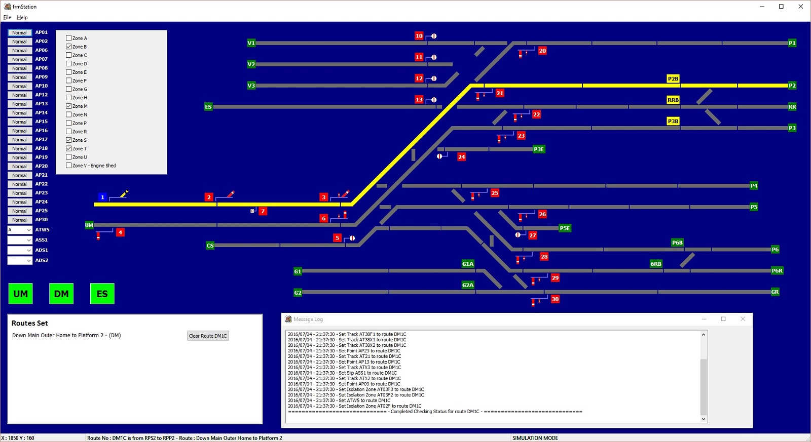 April 2016 This is the software application that I'm developing for the station. Some parts of it are for debugging so they will disappear in the final version. The idea is that you select the controller you want (Up Main, Down Main or Engine Shed). You the select the start point of the route and the end point. The software checks that all of the components are not locked by a different route, sets the points to the required position, checks they have moved to the right position, locks all of the components to the select route and controller and then clears the signals. A database sits behind it which defines all of the items on the screen. You allocate track items, power zones, isolation zones and signals to the route in the database. It's taking a fair amount of work to debug the database and wiring but trains are running! You can see it in action here. |