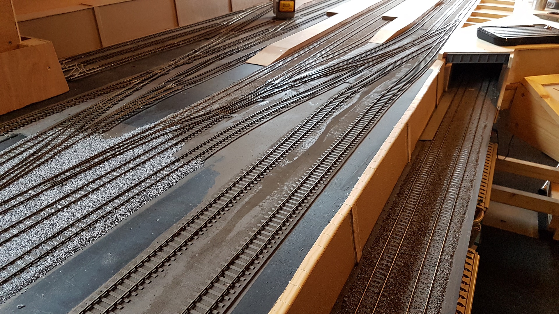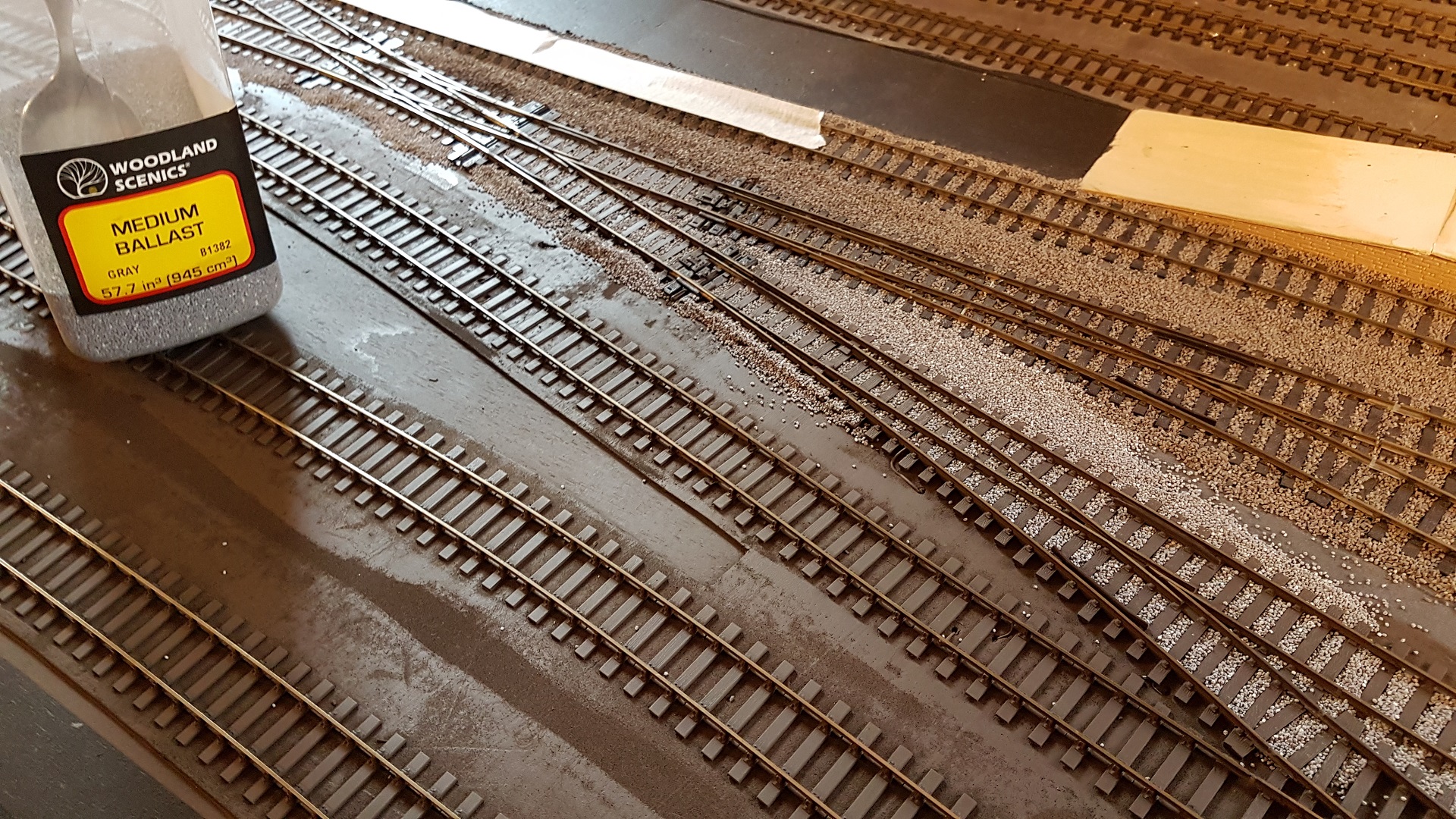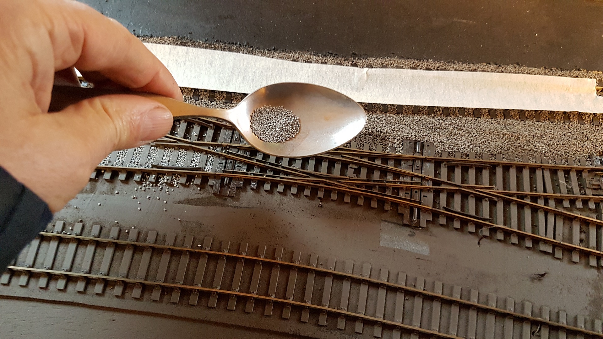 I do have a ballast spreader which I use on plain track - it is too wide for platforms. The best method when using it is to push down very hard while spreading. |