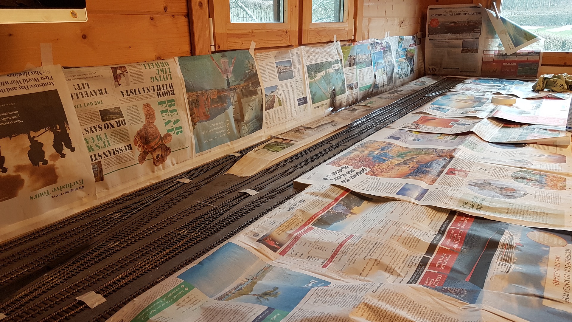 Meanwhile my wife has been persuaded to have a go at the backscene. We've plonked a few trees in the front temporarily to give it some depth. Makes it start to come to life, doesn't it? |