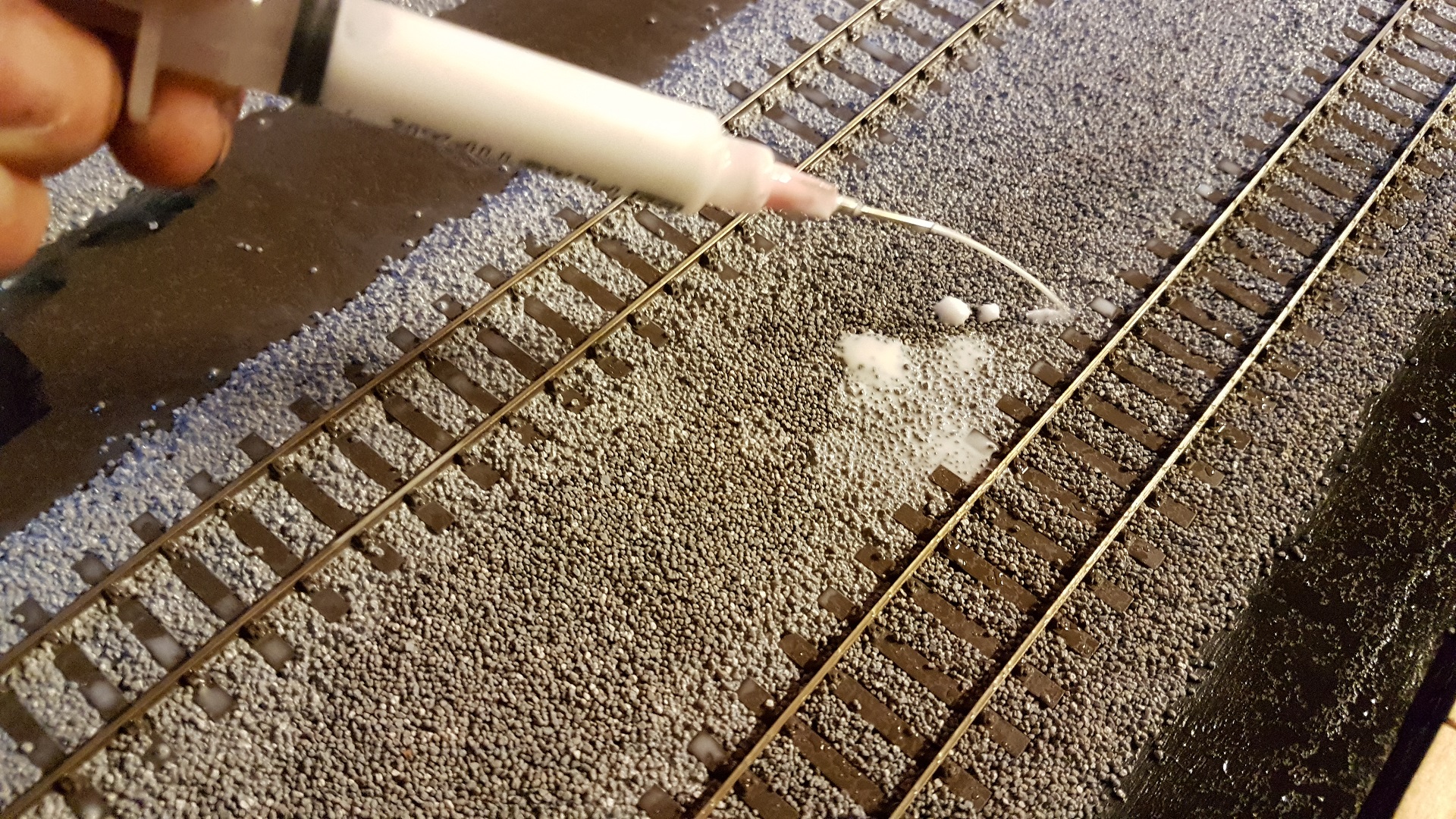 Now the critical time. If anyone tells you that you don't need to pre wet your ballast and you just apply some wonder mix - don't listen to them. The old fashioned way works. Find a decent mister (gardening misters are just the job) and add a couple of drops of washing up liquid to water. Mist the whole area. If the ballast isn't damp, it will deform when you try to apply the glue. Next PVA glue mixed with water 50:50 is prepared, along with another couple of drops of washing up liquid. I then apply it to the track using a syringe as shown. You've got to go carefully as if the glue comes out too quickly, it will move the ballast.