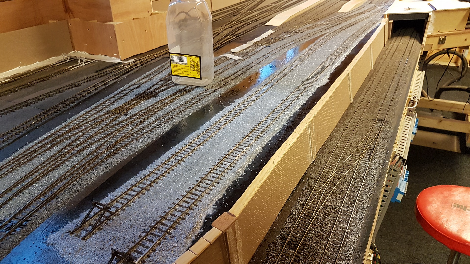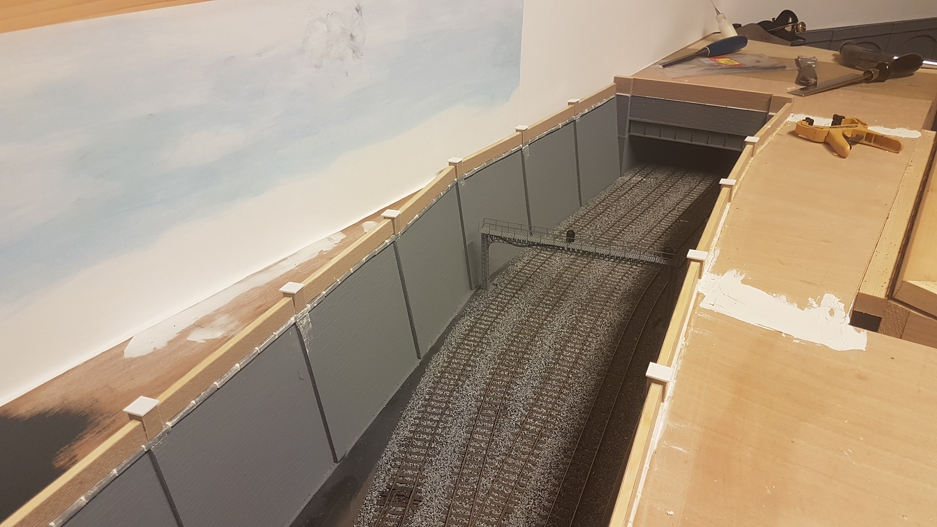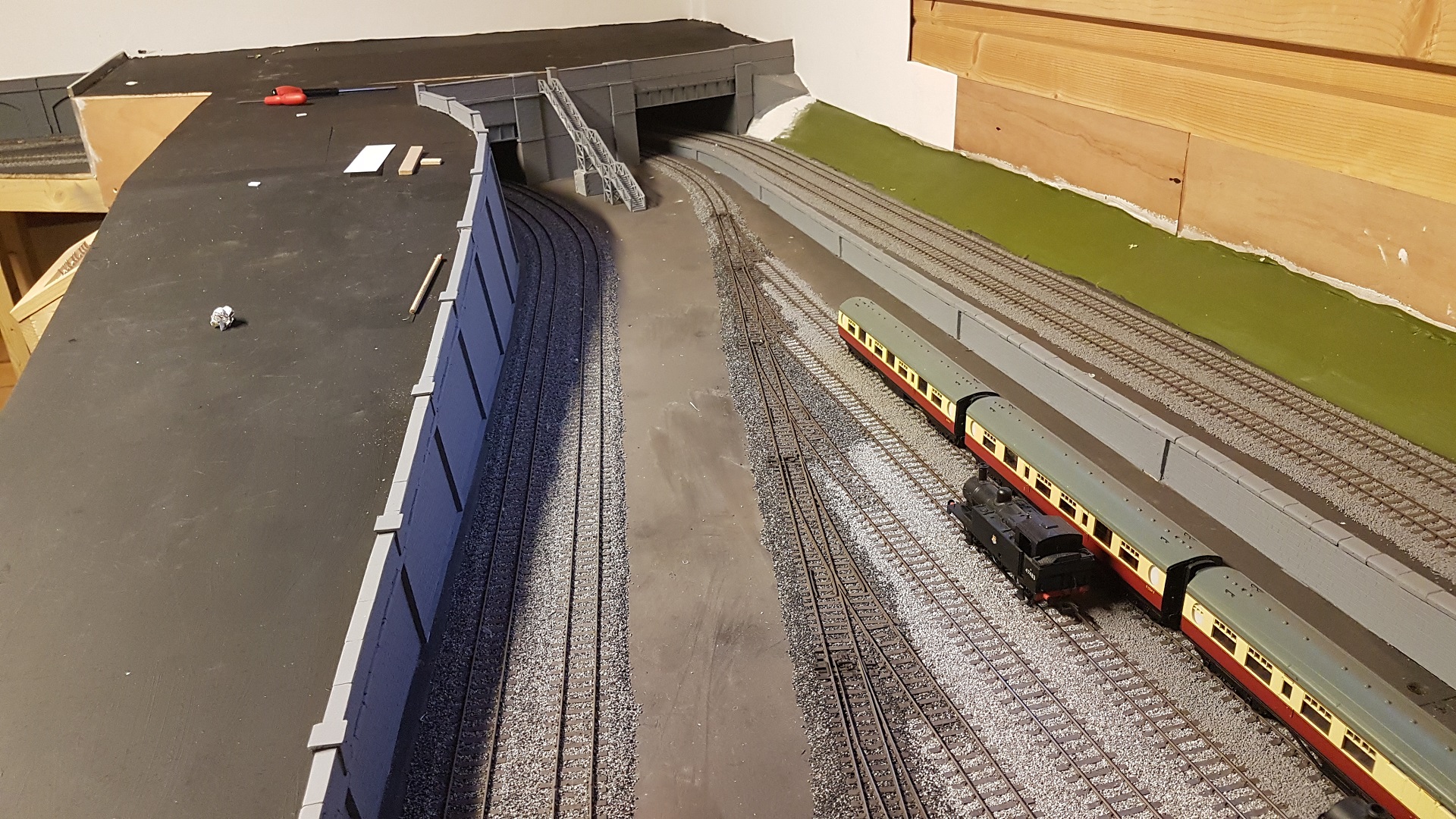 As a break for ballasting, this area around the terminus station needs to be boxed in. The central section needs to be accessible for track cleaning.