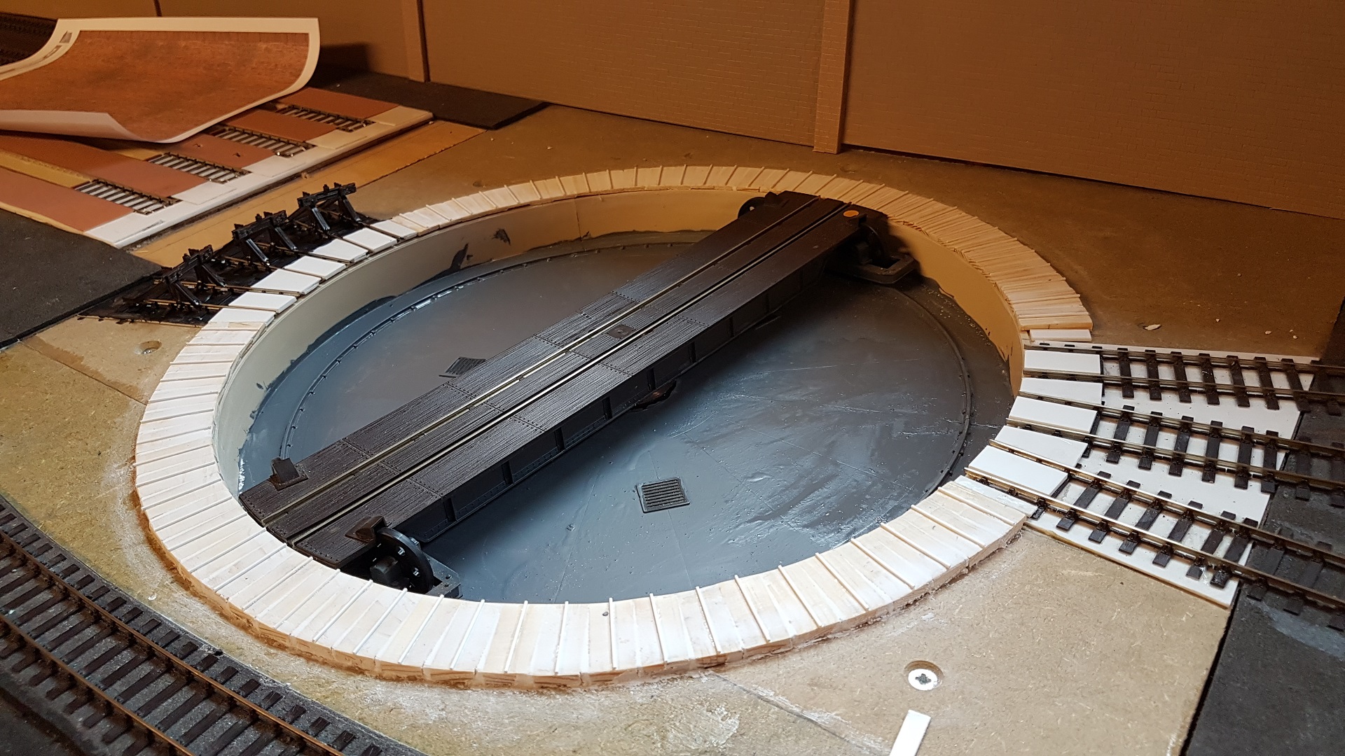 There seems to be 2 main installation systems for the prototype turntable. One is where the sleepers and the rails are above the surrounding surface, the other is where the rails are flush with the surrounding surface. Most people seem to go with the former with the Peco turntable and they end up with the ugly plastic rim of the turntable showing. I decided to go for the latter hoping to retain the facility of the ADM turntable in being able to lower the turntable from below, should maintenance be required. I also wanted to model the small 'bars' around the turntable so the crew could have some foot purchase should they have to push the loco round by hand. I cut a large number of small blocks with a rebate on the lower side facing the turntable. You can see the gap. The idea is that this gap will be covered by brickpaper. The bars are 0.3mm plastic strip. |