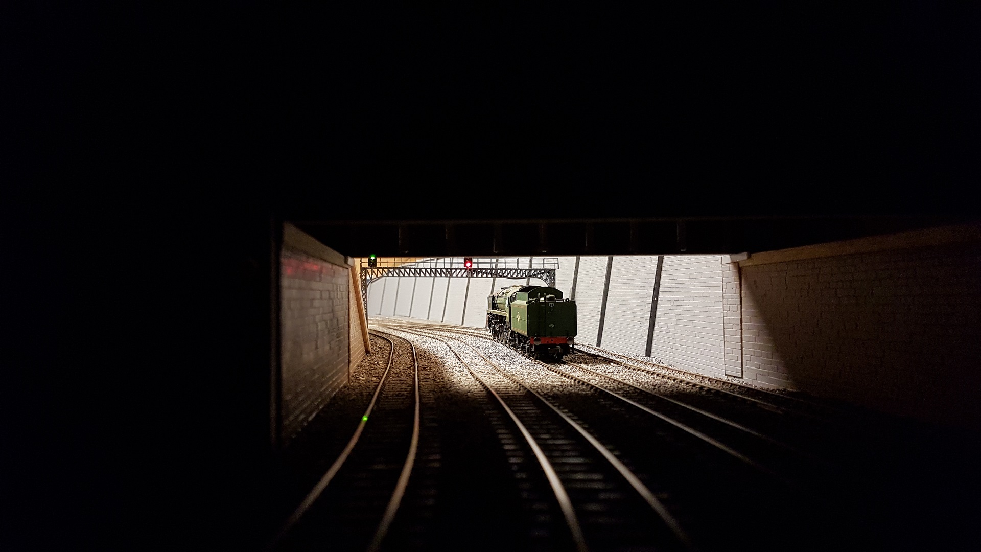 Although I want the signalling to primarily utilise semaphores, I know my limits! The gantry is from Traintronics (unfortunately no longer available) and I had to buy 2 in order to span the tracks. A ladder is still required and I need to do something about the cable. The signals are 3 aspect and are electronically interlocked with the Up Main starter and the points. My Britannia "Earl Haig" waits for the road. I like the atmosphere but a bit more grime and grot needs to go in. At the moment, the walls only have been primed. |