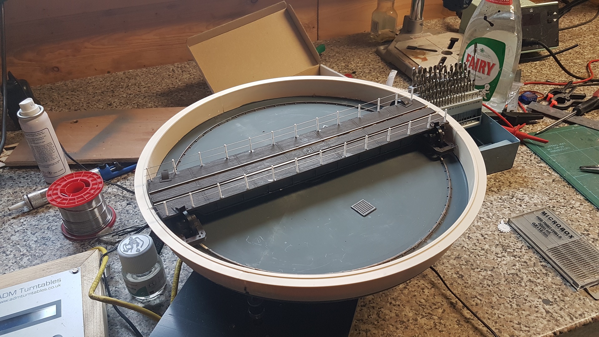 I had a bit of a disaster with the turntable. I was trying to fit brick paper and used glue that was too thick. Consequently, the turntable bridge started to foul the brick paper. In an attempt to remove it, I accidentally had the heat gun turned up too high and managed to distort the well. Alastair from ADM Turntables kindly repaired it with a new well. As the turntable was out, I've fixed the handrails. The Peco handrails are far too clumsy so I used Slaters stanchions with fine nickel silver wire. |