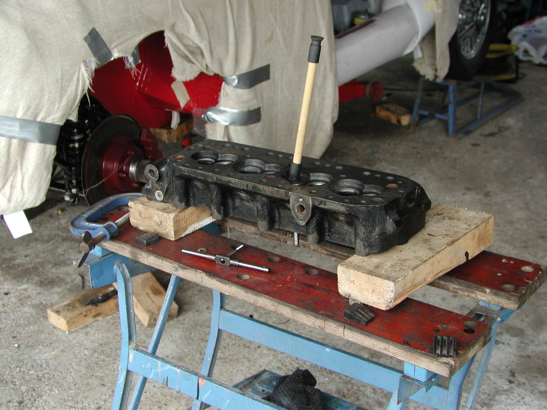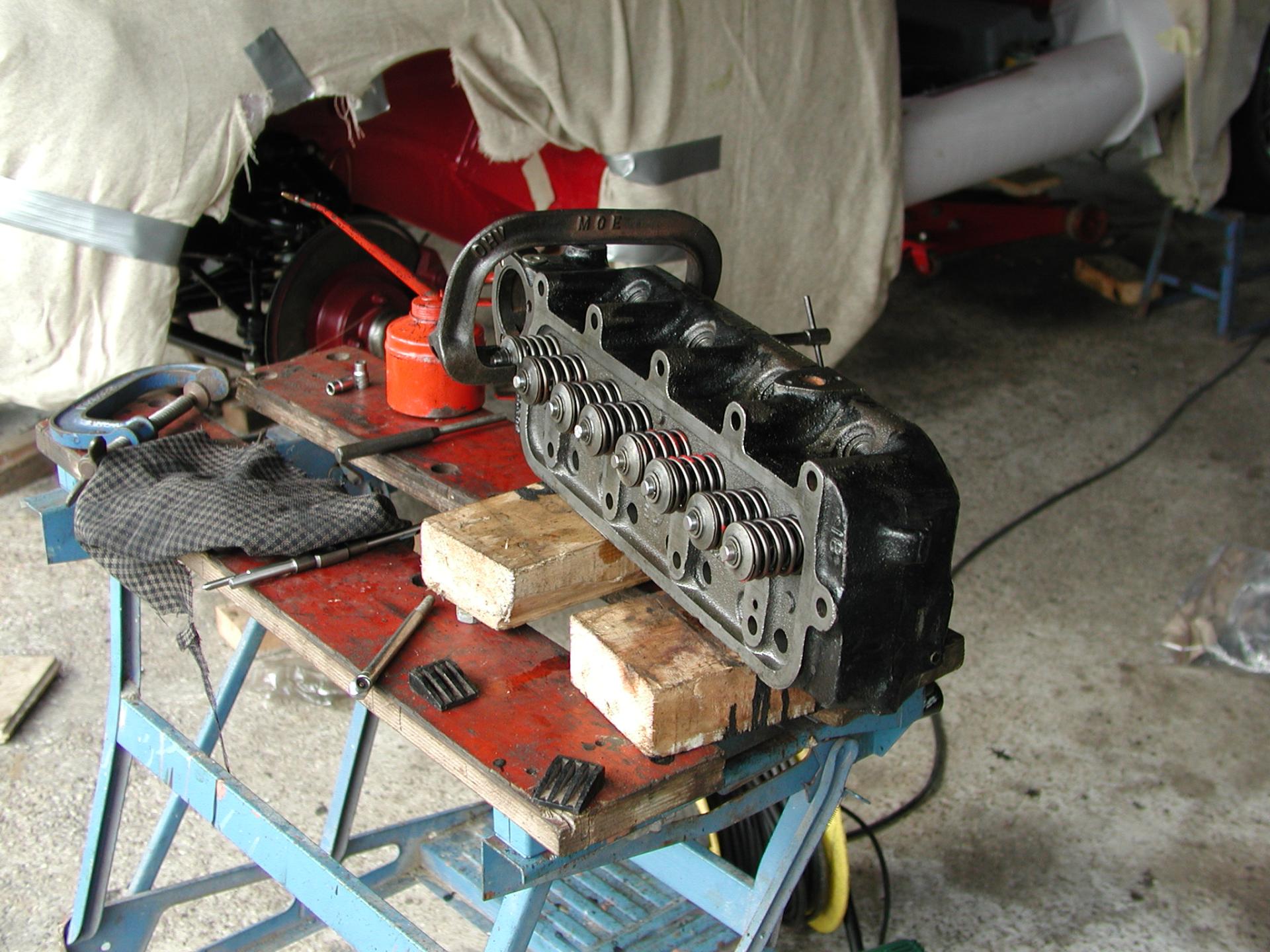 The cylinder head had new valve guides, valves and springs. I decided to fit a 4 into 1 manifold as I always had trouble with the exhaust/manifold joint with the cast iron manifold. The next time I overhaul the cylinder head, I've got to do something about the thermostat housing stud holes as one is not true. The housing has gone on this time. At this stage another coat of paint went on the engine and cylinder head. |