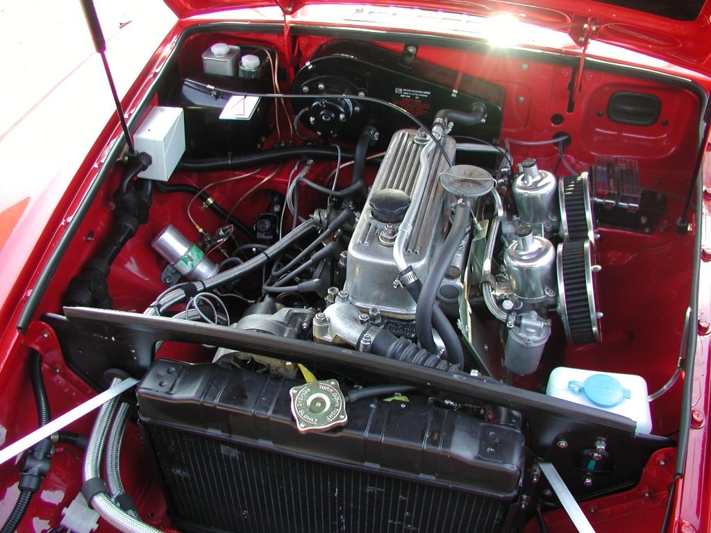 Finally, the finished article. Carbs are exchange units from the MGOC. I eventually worked out what the lug on the top of the pedal box cover was for! The 2 support strips for the front of the radiator mount were new to the car. The lack of them probably explains why the old mount was cracked. |