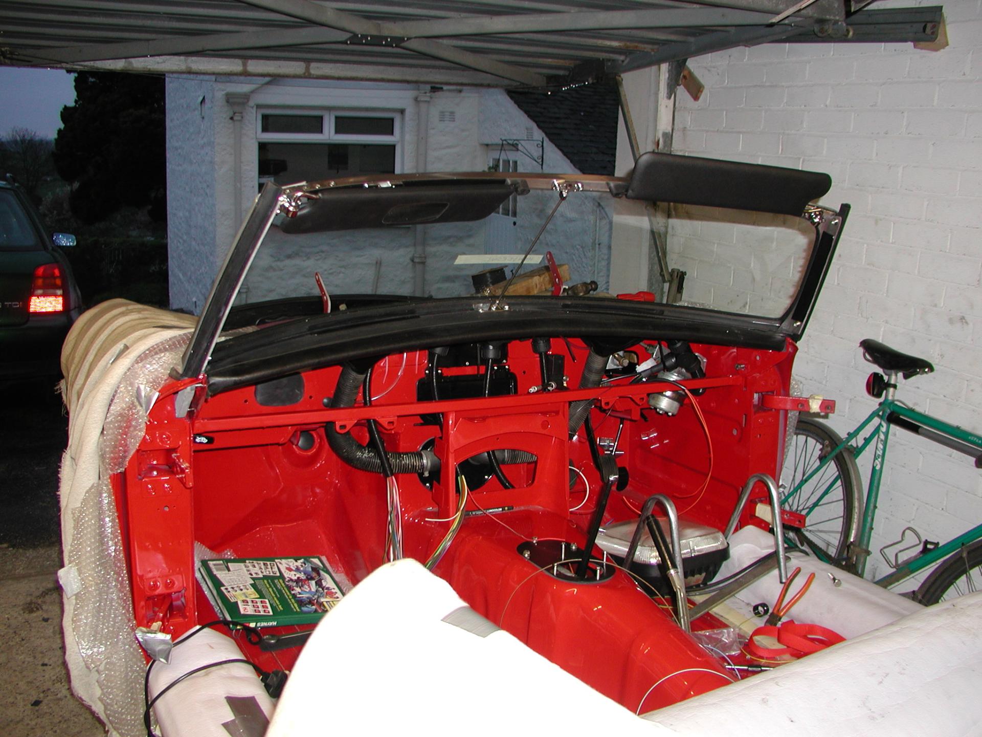 Once the windscreen was in, the dashboard was fitted and the car suddenly starts to look like a car. The dash took a bit of persuading, especially around the steering column but it fitted better than the MG restoration manual implied. |