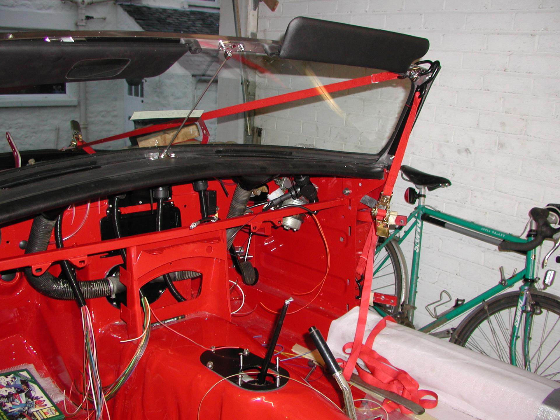 Ratchet tie down straps were my answer. One down to the front grille area and the other to the bottom door hinge opening. First, I pushed the windscreen as far forward as possible within the scuttle holes. Then its a matter of working the 2 straps. Concentrate on getting one bolt in, then tighten the other strap so that the other bolt can go in. Part of the problem is that you've got to compress the windscreen body seal which will be new and which doesn't want to be compressed. |