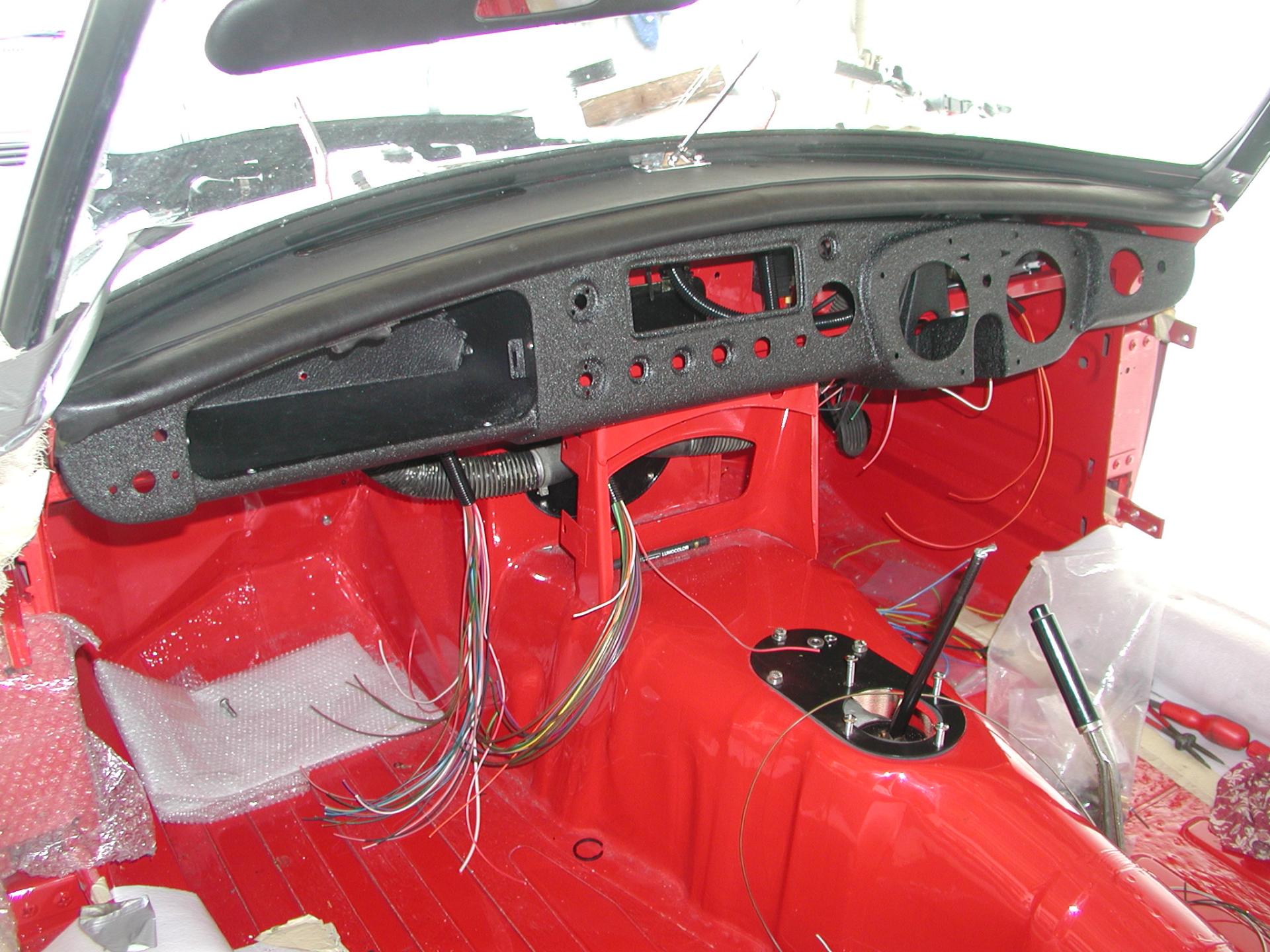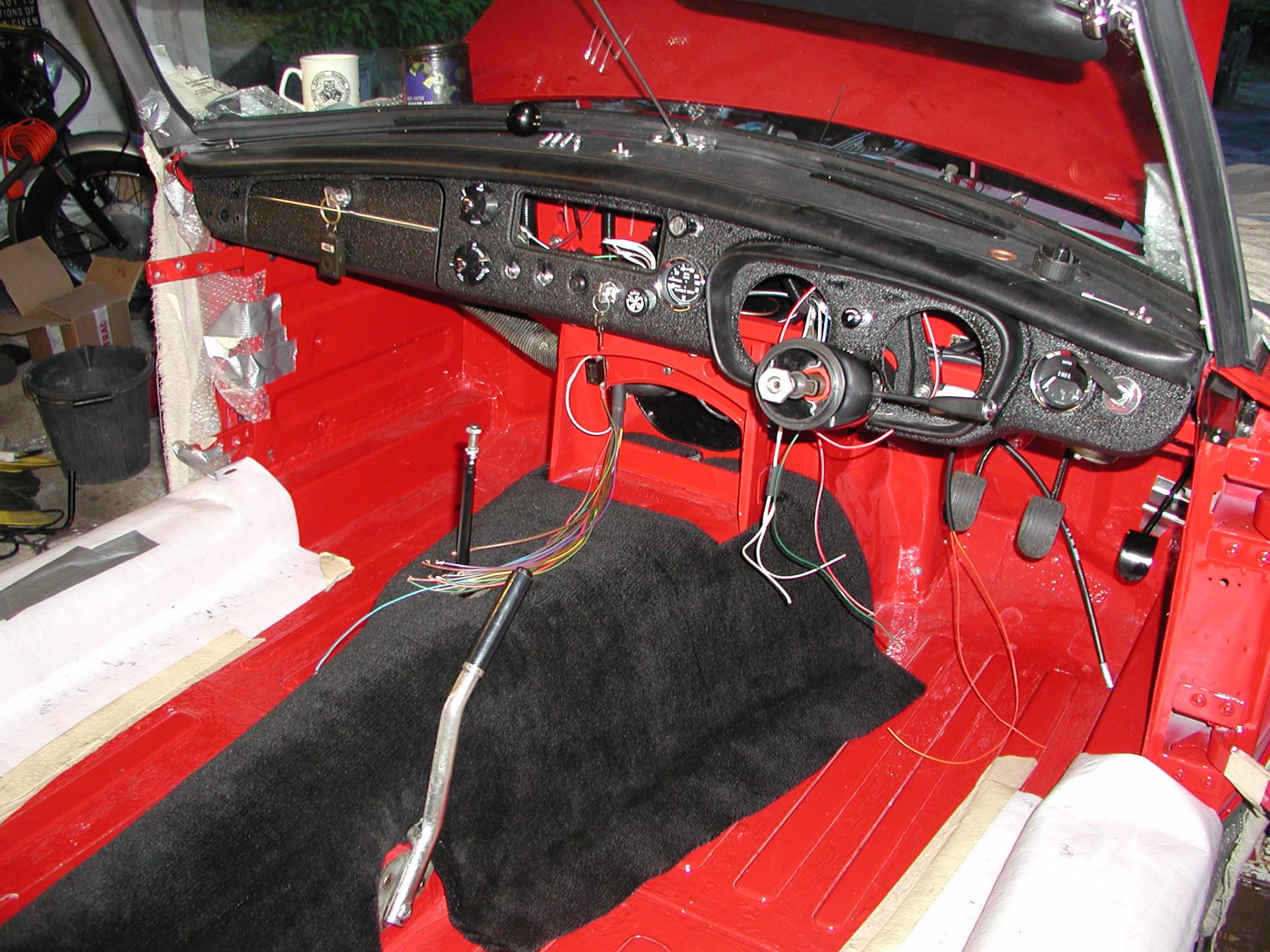 The steering column was next - the 'U' bracket is inverted and that caught me out. Then I wired up all of the switches in turn and connected the heater/air controls. The tunnel carpet fitted much better than the last time I did this - from MGOC. |