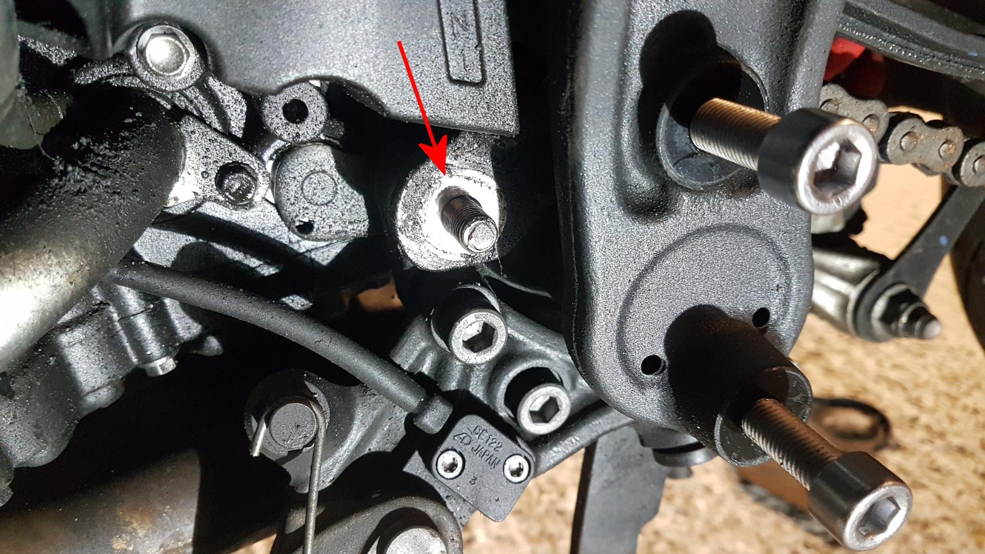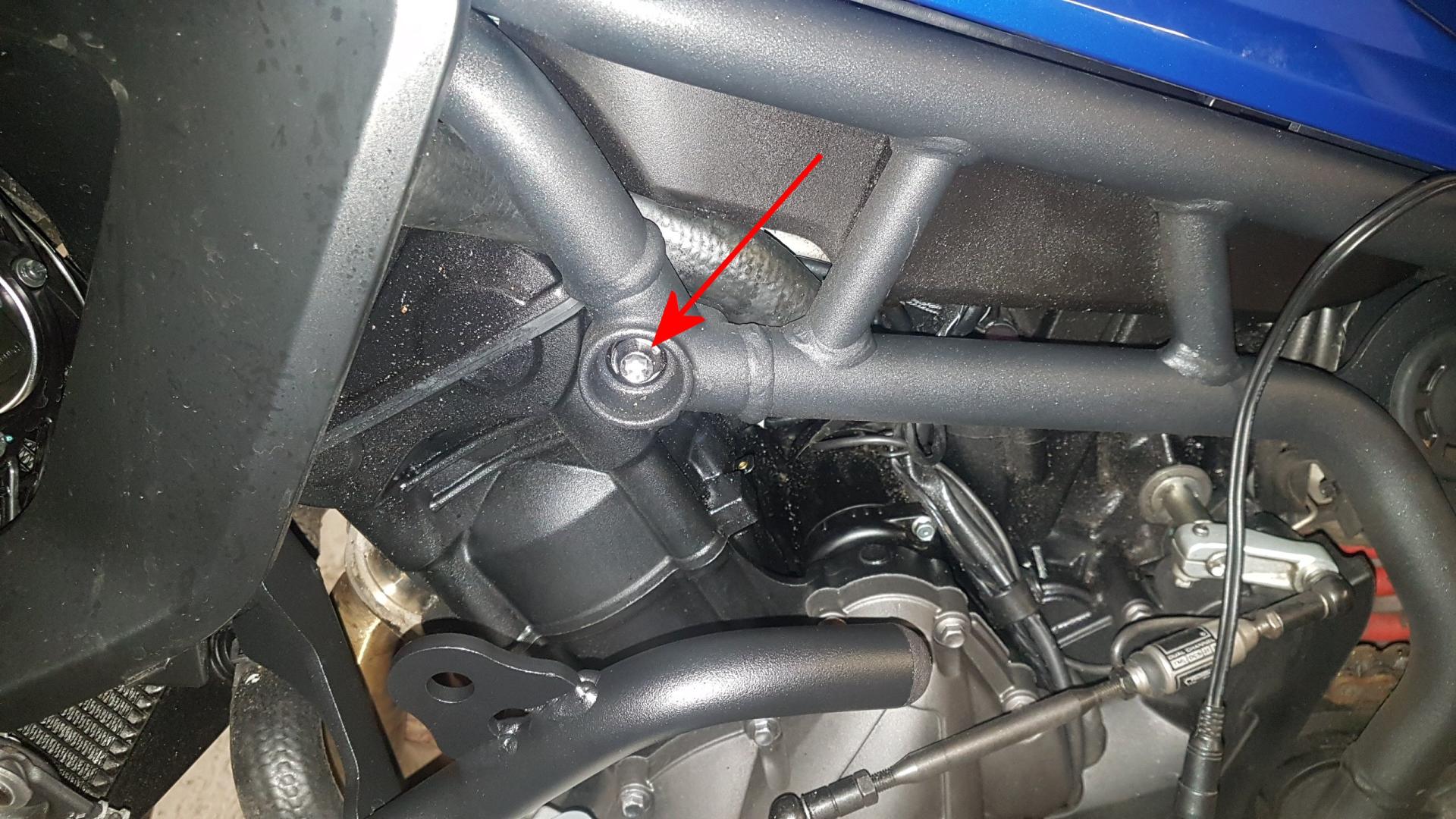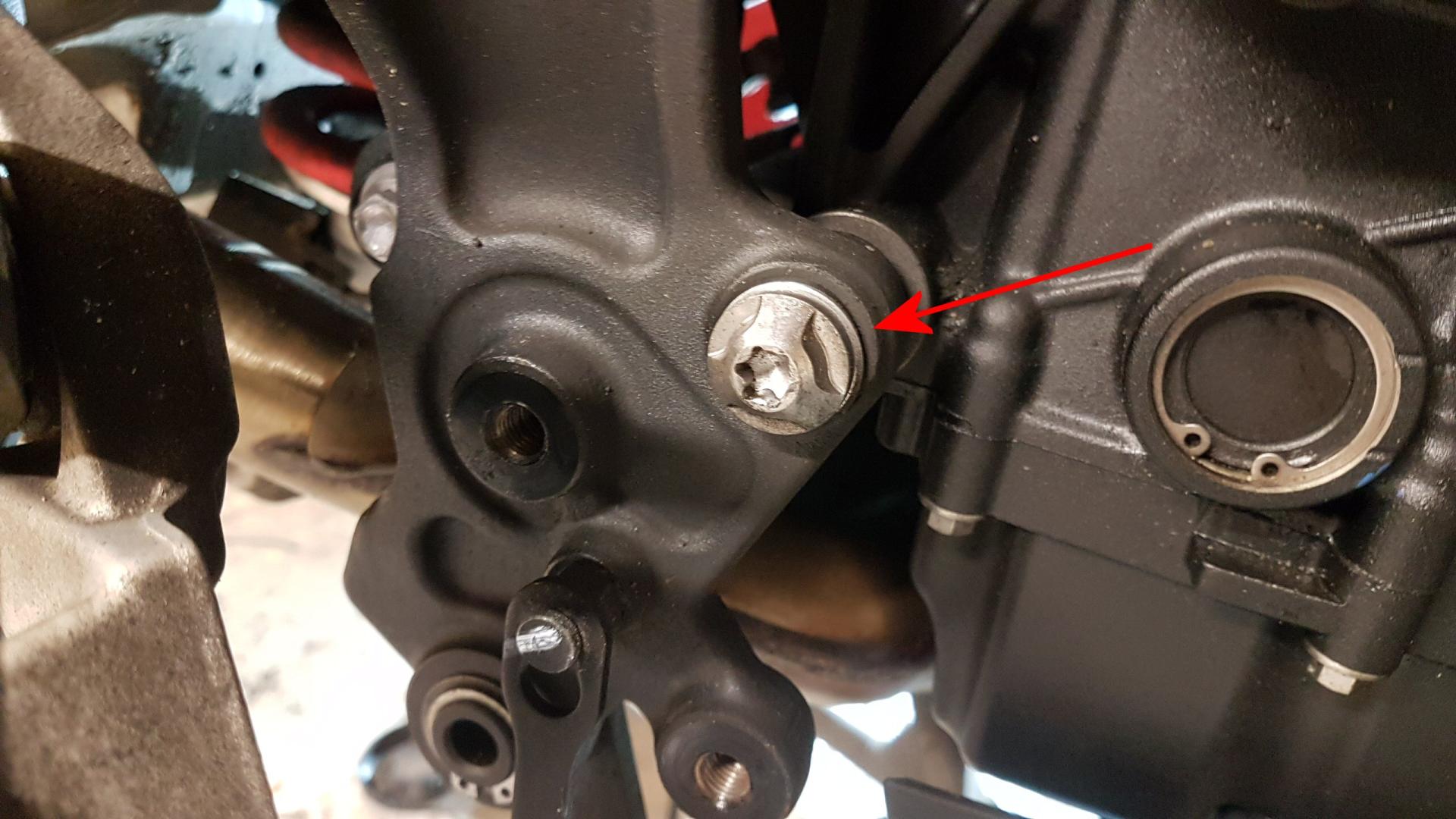 Much easier with a helper! You can lean over the saddle with one hand to hold the end of the bolt while you undo the nut - I did but it’s a bit of a fiddle. I found that the bolt was loose once the nut was undone (i.e. there was no weight on it) and it was very easy to knock it back into the frame while getting the engine bar into place. You don't need to remove the bolt, just push the protruding thread back to the frame |