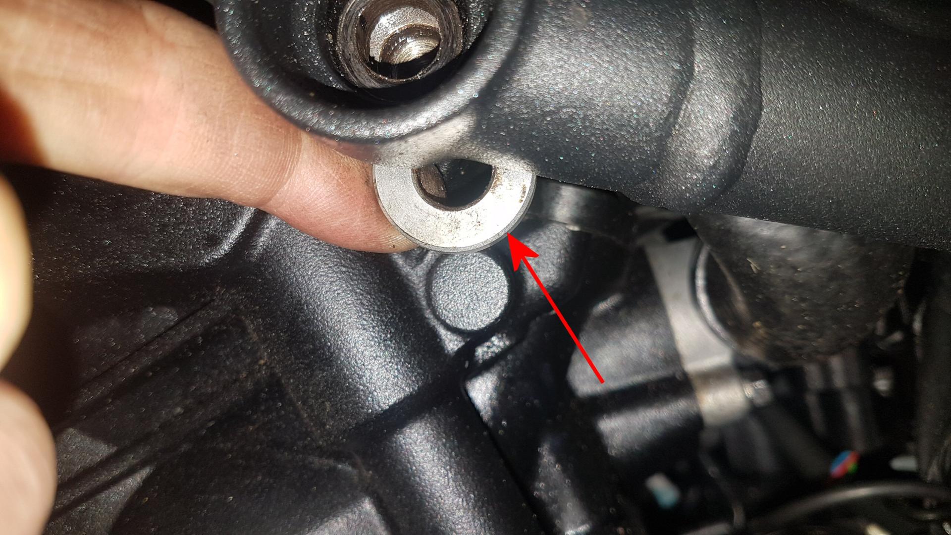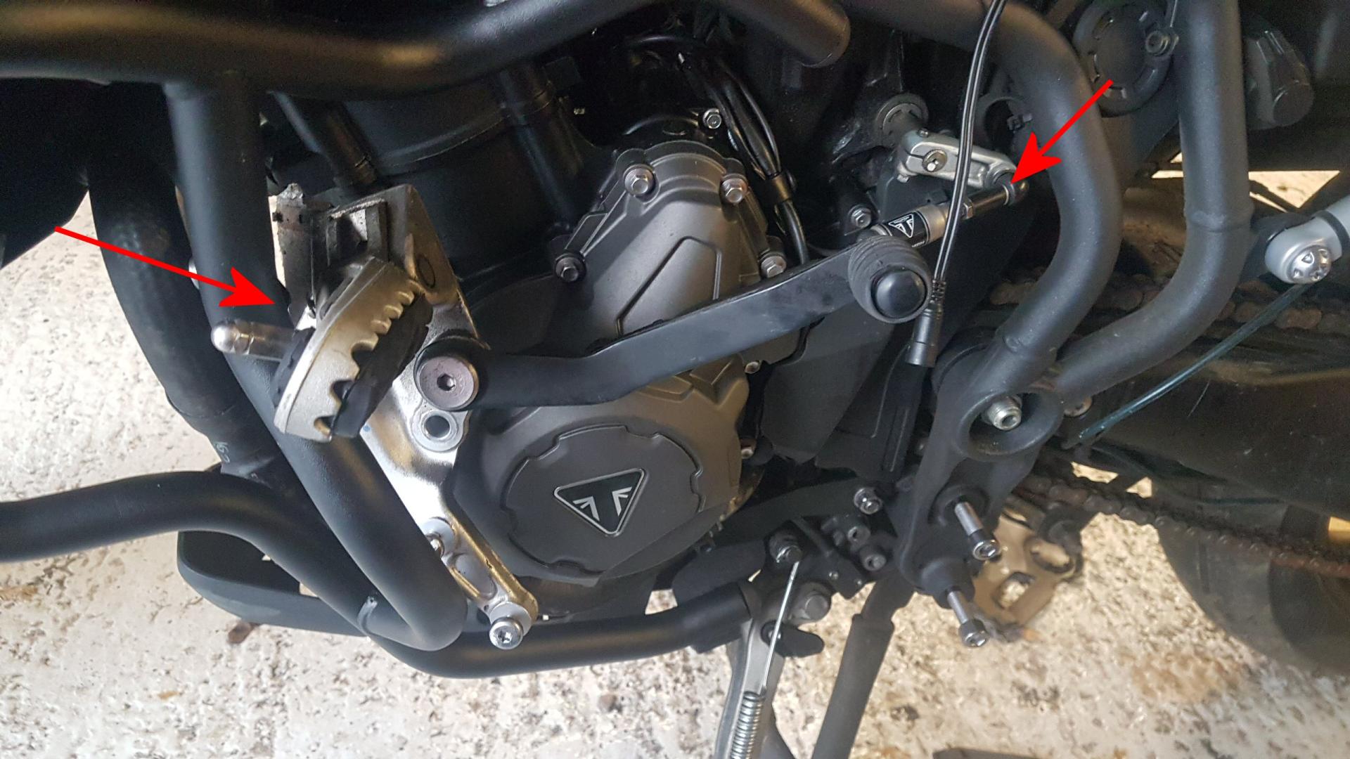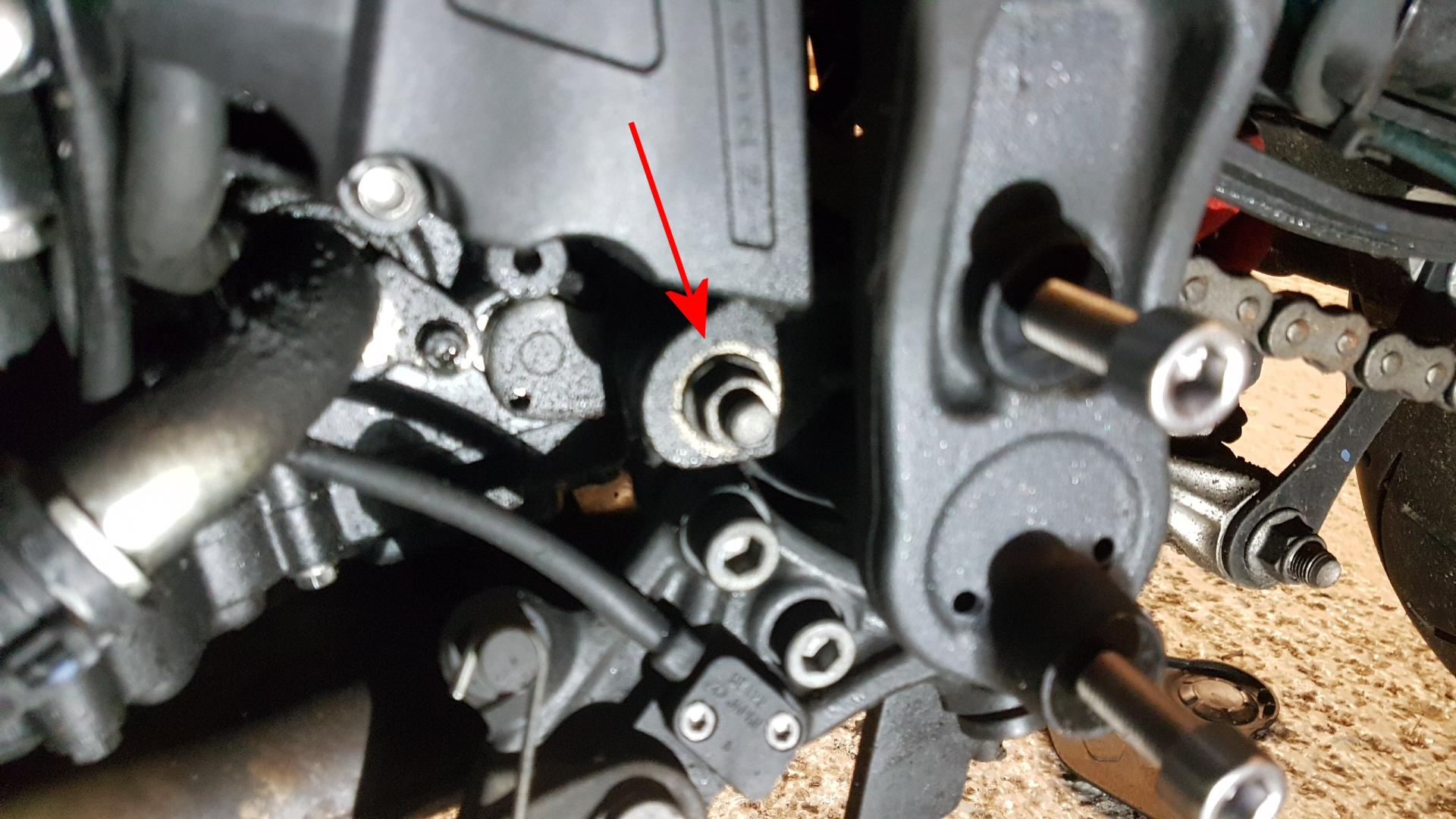 Much easier with a helper! You can lean over the saddle with one hand to hold the end of the bolt while you undo the nut - I did but it’s a bit of a fiddle. I found that the bolt was loose once the nut was undone (i.e. there was no weight on it) and it was very easy to knock it back into the frame while getting the engine bar into place. You don't need to remove the bolt, just push the protruding thread back to the frame |