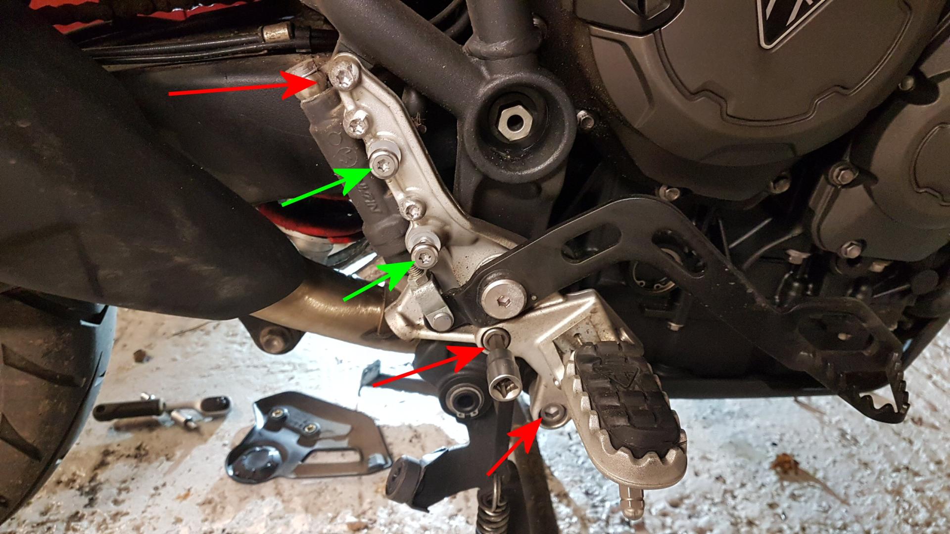 Now we go round to the right hand side and remove the RH foot rest assembly. First remove the plastic cover held on by the 2 socket heads indicated by green arrows. Now remove the foot rest assembly by removing the bolts indicated by the red arrows. It's disappointing to see the top bolt corroding after only 4 months from new. |