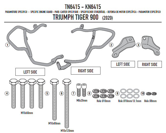 I've fitted Givi Engine bars to my 2022 Triumph Tiger 900. I managed to accidentally drop my previous bike and make a slight scratch on the tank. So the engine bars are an attempt to stop that happening again. I couldn't find any YouTube videos on fitting the bars. The Givi instructions are OK but aren't very clear in a few places so I took photos as I fitted them. It takes about a couple of hours going carefully. Givi says "we recommend fitting by a qualified mechanic" but I don't think it’s a problem. The main area to be careful with is to ensure that you don’t get any crossed threads. For that reason, assemble everything with loose bolts before you tighten. You will see that I changed the order of assembly in one situation to avoid that.
